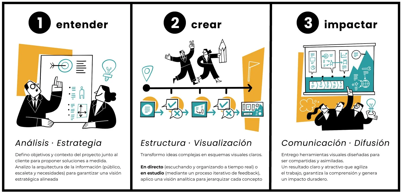 A través de una visión estratégica y analítica, ayudo a empresas y equipos a sintetizar sus ideas, agilizar procesos y comunicar con un valor añadido que genera resultados. Diseño estructuras visuales para que tus proyectos se entiendan, se compartan y se recuerden.